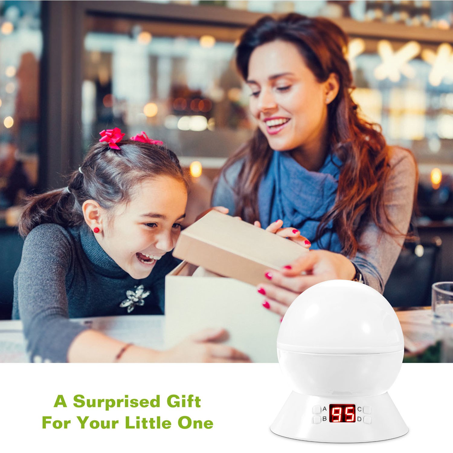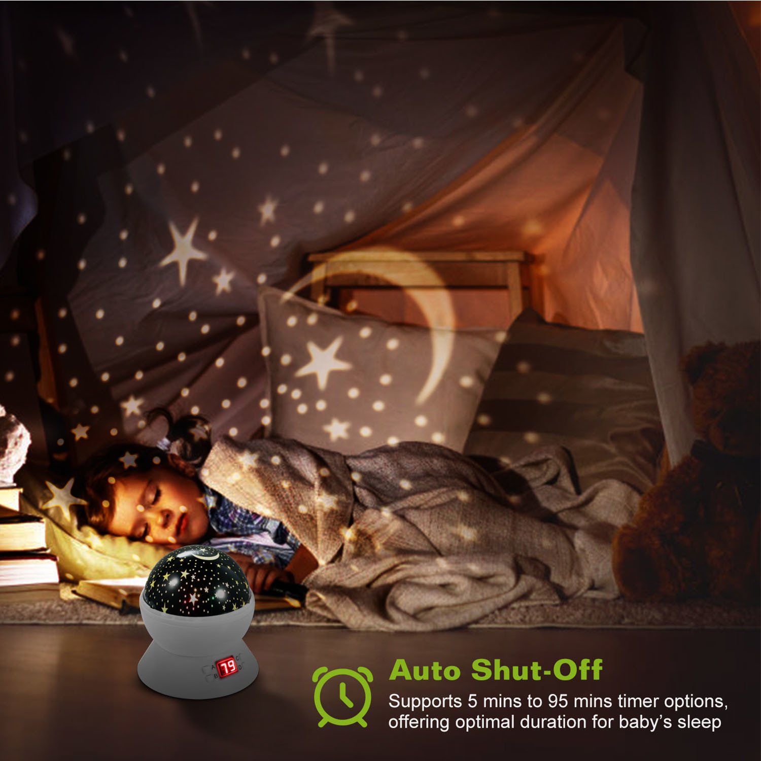 *Amazing Night Light*:Producing a magical lighting effect,our night light magically projects colorful star and moon on ceiling/wall/ground,which bring the starry sky into your kid’s room,creating a warm and relaxing atmosphere. With a white spherical cover and night light function,it not only can be utilized as a projector lamp,but also a lighting lamp.