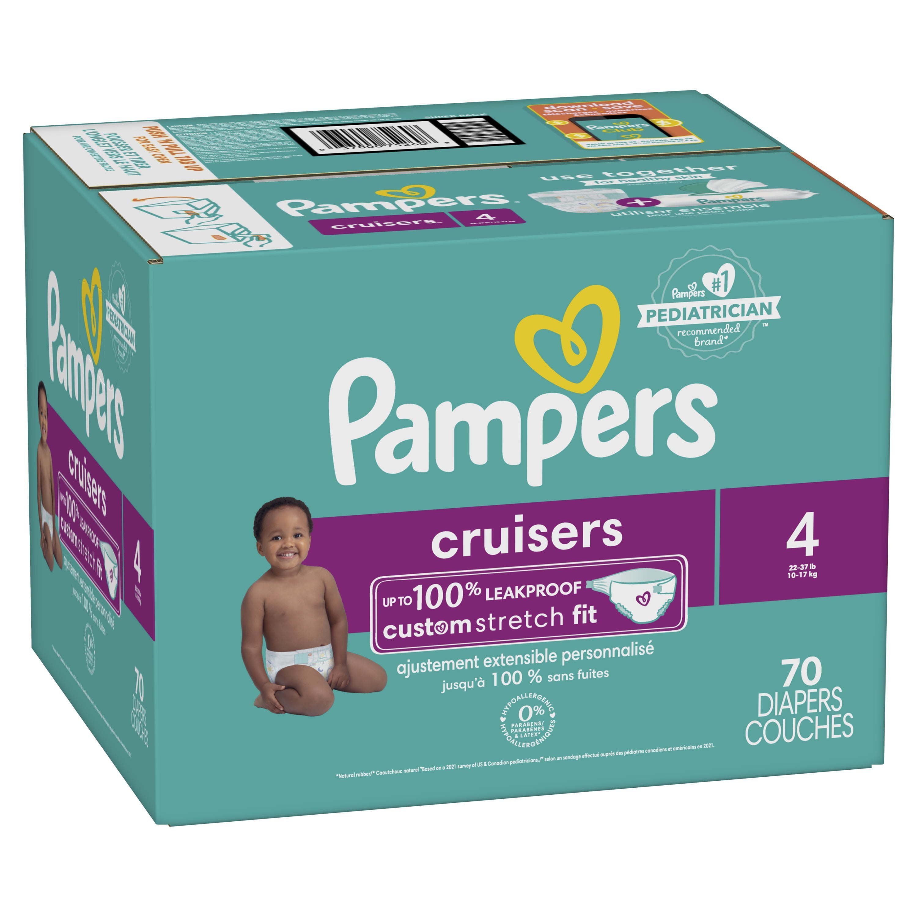 Say hello to Custom Fit and reliable protection for the most active babies! Pampers Cruisers adjust to your baby's unique shape and size with our Custom Stretch Fit System, featuring 2x stretchier* sides for a comfy, long-lasting fit perfect for babies on-the-go. Plus, our easy-to-use fit guide on the front of the diaper helps you get the perfect customized fit. So, no matter how much your baby moves, their diaper will stay put.Pampers Cruisers are also specially designed to deliver up to 100% leakproof protection thanks to our Dual Leak-Guard Barriers that gently seal around your little one's legs and bottom to stop leaks where they happen most. Plus, Cruisers feature our LockAway Channels that absorb wetness and lock it away from skin. And forget about wondering when your baby needs a change. The Pampers Wetness Indicator lets you know, eliminating messy guesswork. Pampers Cruisers come in a variety of prints to protect your baby in style. Plus, Pampers Cruisers are hypoallergenic and free of parabens and latex,** so, they're gentle on your baby's skin.Pampers Cruisers diapers are available in sizes 3, 4, 5, 6, and 7. Packaging and prints may vary.*Vs. the leading moving baby sub-brand**Natural rubber